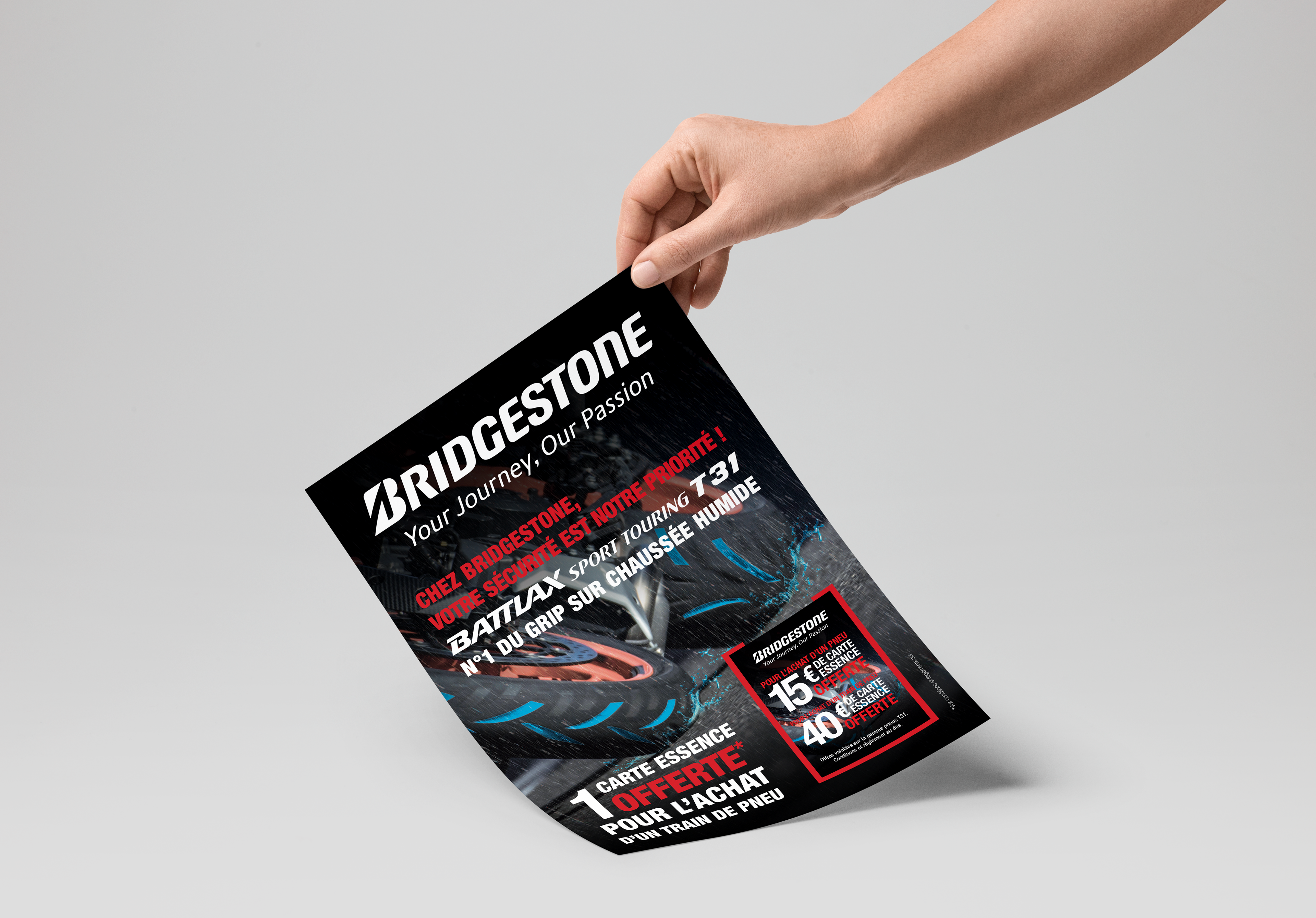 Création et réalisation graphique de multiples supports. Opération destinée à mettre en avant le pneu prenium T31 "Freinage sur chaussée mouillée".