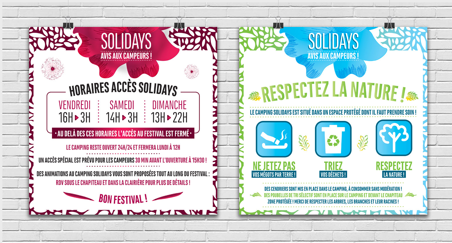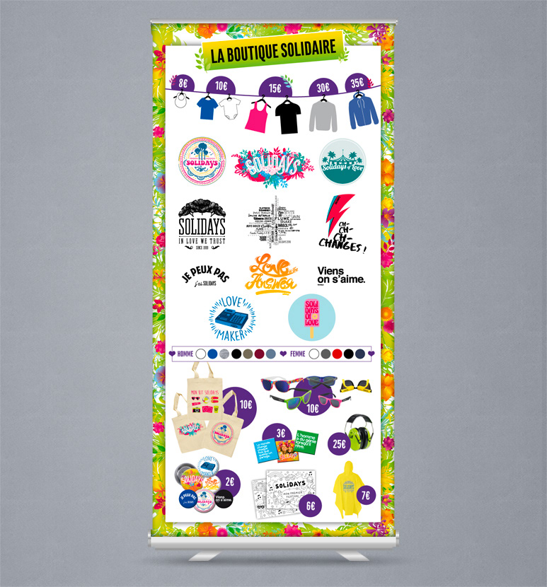 Partenaire des Solidays depuis 2011. Créations et réalisations graphiques de multiples supports tels que PLV, signalétique, affiches, habillage objets dérivés, plans, scénographie, panneaux, ...